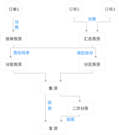 汇总拣货:多张订单汇总数量后统一拣货,然后按订单分拣。
